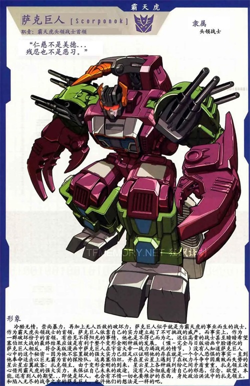 第三代霸天虎首领,变形为蝎型战舰和军事基地。原本是塞伯坦星球到玛斯塔星球避难的移民,后发动叛乱被驱逐,最终投靠了惊破天。但野心十足的他不仅疯狂地炸毁了塞伯坦星球和火星,还陷害了惊破天自立为霸天虎领袖,企图炸毁地球时以自己的巨型身体作为诱饵,企图让汽车人和地球一起毁灭,结果被巨无霸福特击破身体,只好带领霸天虎大部队撤出地球。