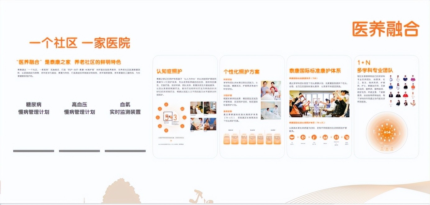 同时,结合中国特色,首创“一个社区 一家医院”医养融合的养老模式,每个社区配备一家二级及以上的康复医院,专注老年慢病管理与康复治疗的同时,满足居民的急救需求。