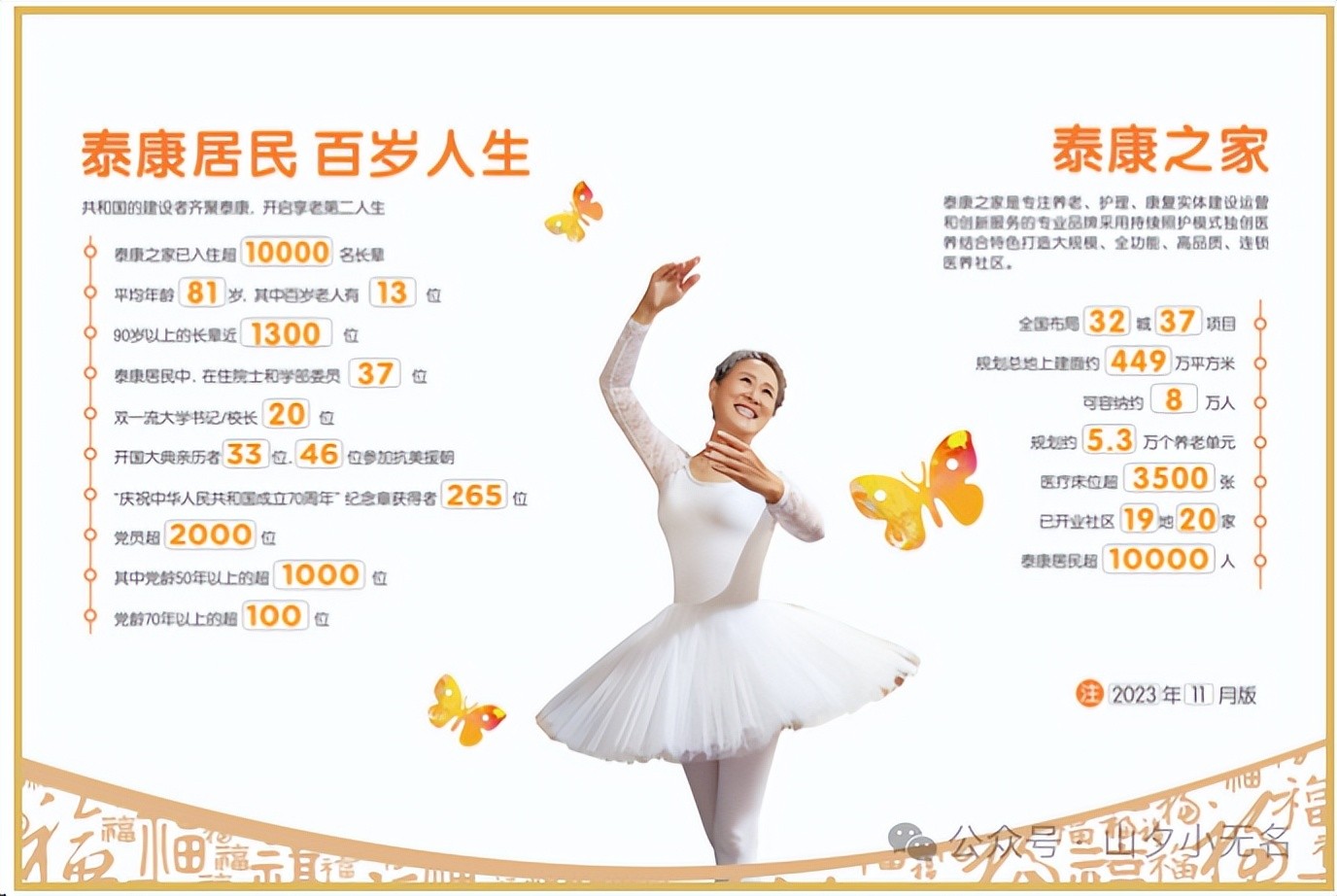 到目前泰康之家已在全国35个城市布局40个项目,目前已开业运营20家,入住居民超过11000位,平均年龄为81岁,其中百岁老人13位,90岁以上的老人超过了1300位。在住居民中,院士和学部委员37位,双一流大学书记、校长20位。