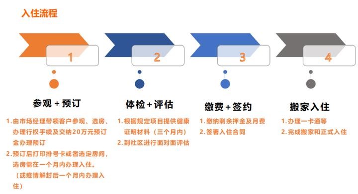 以上就是入住的流程了,一开始是进行参观和预定,其次是要进行一个体检和评估,通过了以后就可以缴费和签约了,最后即可领包入住。
