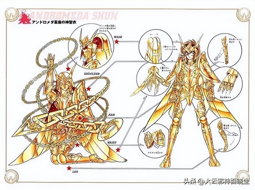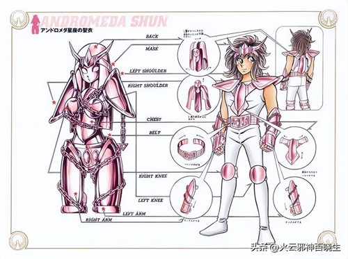 下面是漫画里初版的仙女座圣衣,看起来比较简陋,需要注意的是仙女座胸前两片圆形护甲穿到身上则是护膝,不知道如果是女性圣斗士会不会保留在上半身。而组成仙女座圣衣的大腿的居然是左右腕甲。