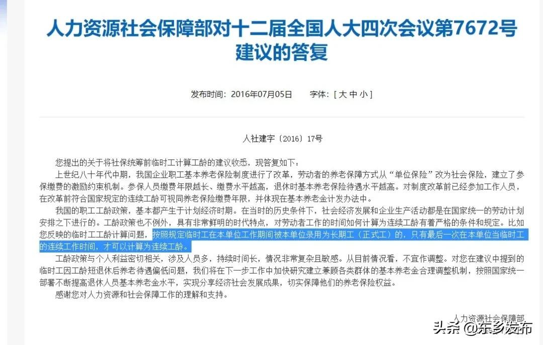 注意2:临时工转固定工,《人力资源社会保障部对十二届全国人大四次会议第7672号建议的答复》临时工最后一次在本单位当临时工的连续工作时间,才可以计算为连续工龄,可视同为养老保险缴费年限。