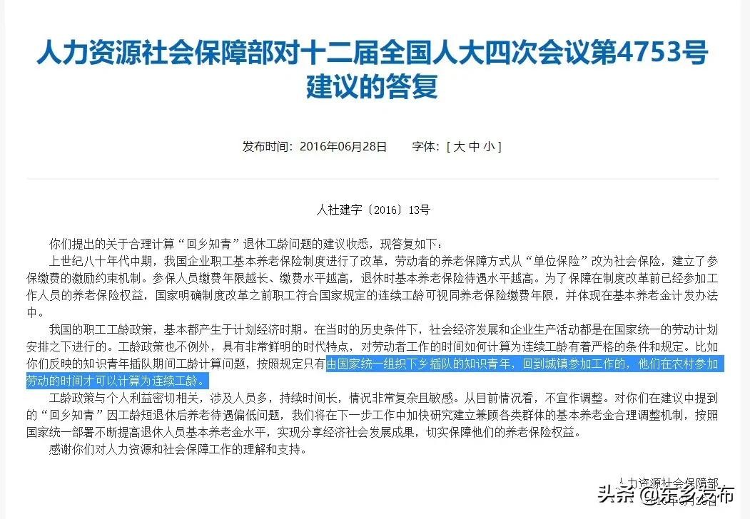 《人力资源社会保障部对十二届全国人大四次会议第4753号建议的答复》中明确表示:由国家统一组织下乡插队的知识青年,回到城镇参加工作的,他们在农村参加劳动的时间才可以计算为连续工龄,可视同为养老保险缴费年限。