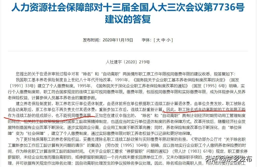 《人力资源社会保障部对十三届全国人大三次会议第7736号建议的答复》中明确表示:职工除名或自动离职前的工作年限不能作为连续工龄的组成部分,也不能视同缴费年限。