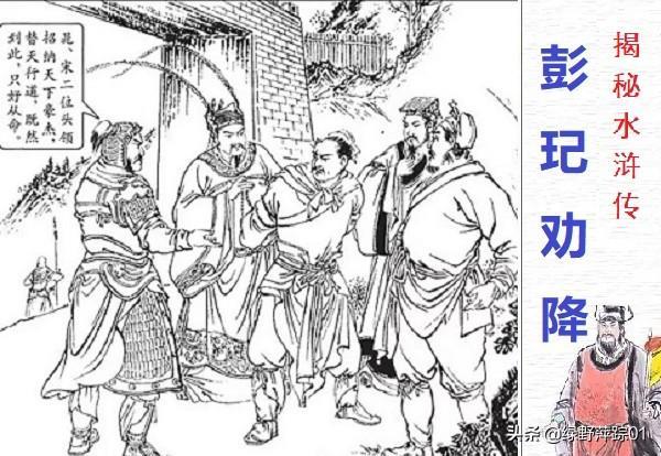 呼延灼进攻梁山时,宋江带兵迎击,先后活捉了彭玘、凌振,在劝降凌振时,彭玘按照晁盖的话,第一次在梁山说出了“招安”二字:晁、宋二头领替天行道,招纳豪杰,专等招安,与国家出力。
