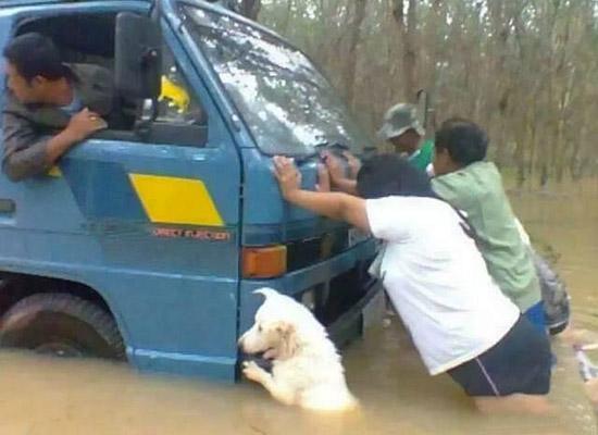 汪星人:来,123大家一起用力推,是不是没吃饭啊!