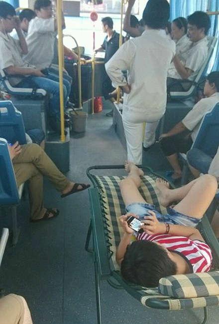 公交车上没座位了怎么办?当然是自备席梦思躺椅,奢华生活!