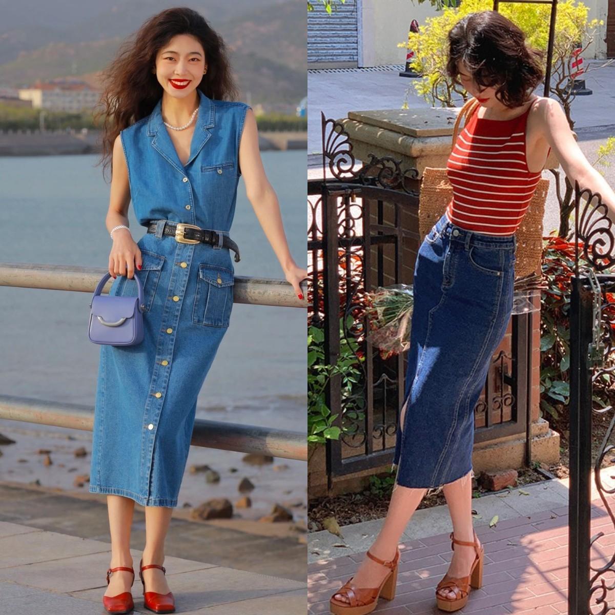 但要想让你的搭配看起来更有女人味,不妨入手下图中(右图)的这种采用了“修身版型”的牛仔开叉裙。将同步曲线勾勒出来,更能穿出显瘦又优雅的魅力。