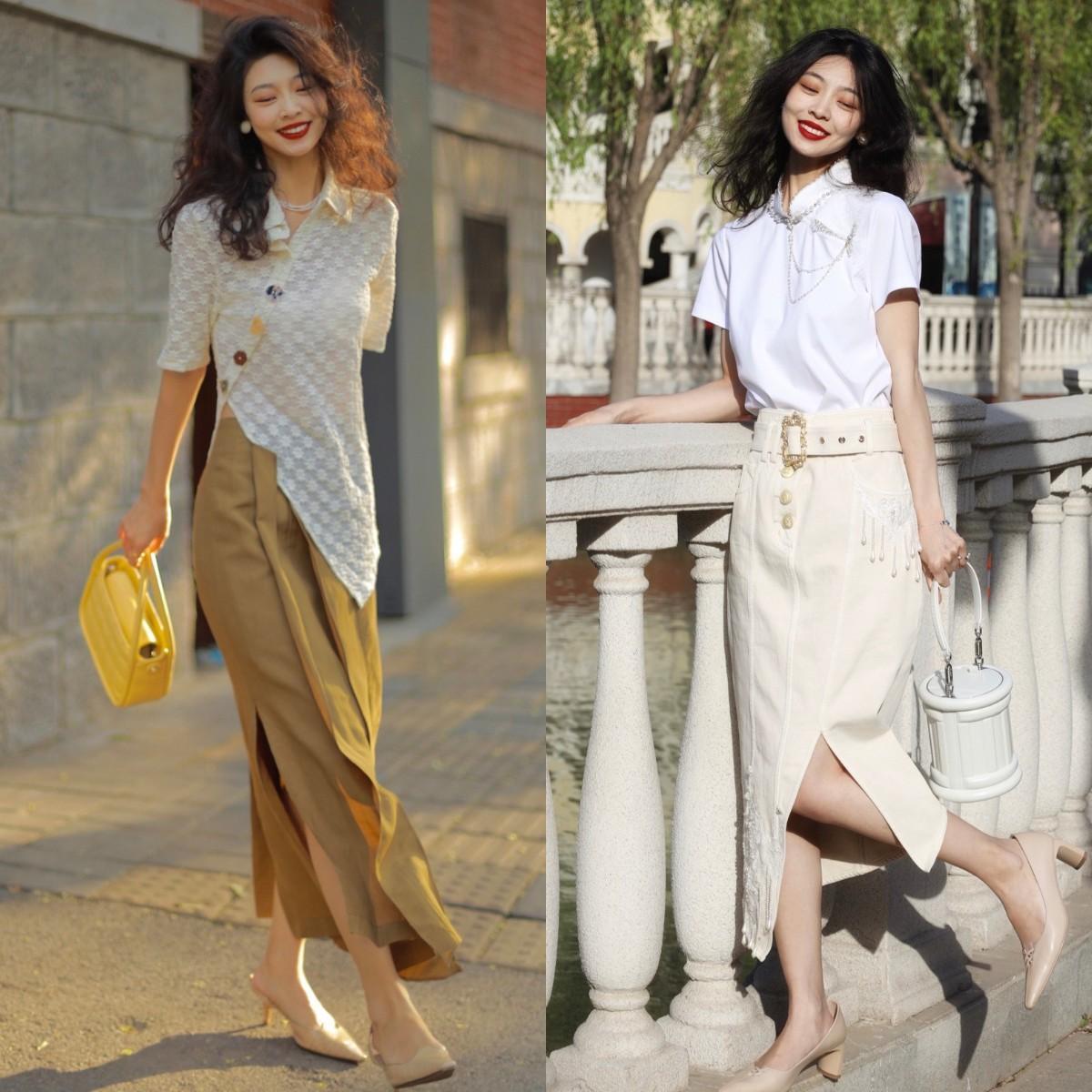 但要想让你的造型更有女人味,那下图中(左图)的这种“包臀开叉裙”与飘带衬衣的搭配会更适合你,会让你的搭配看起来更加优雅性感。