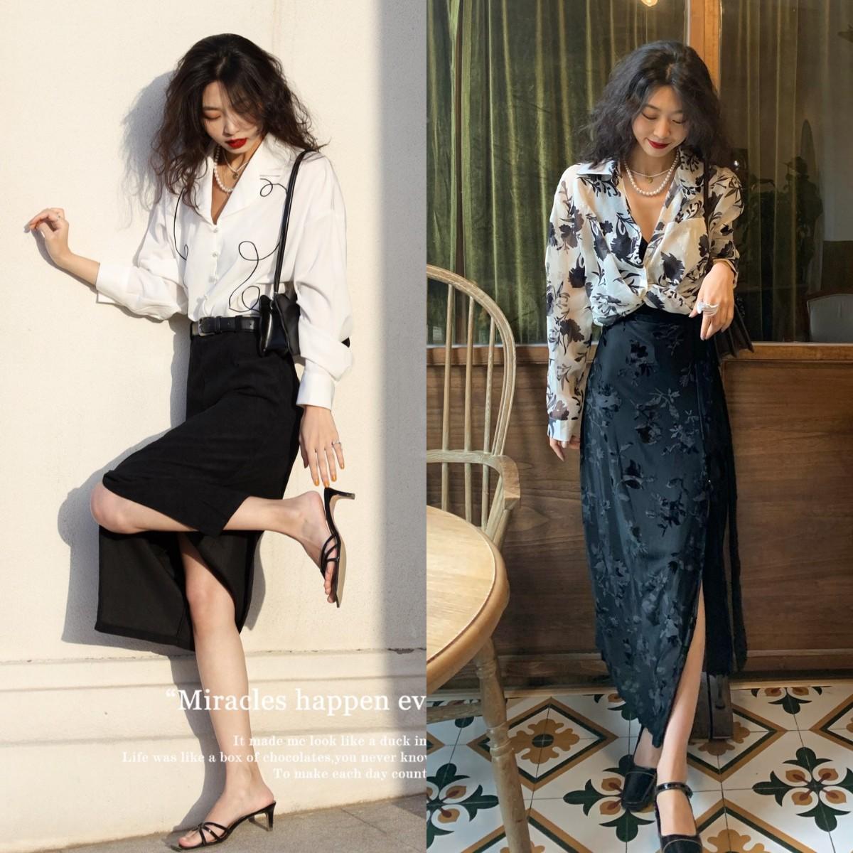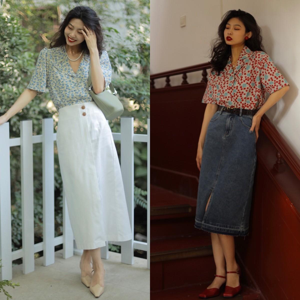除此之外,在衬衣和开叉裙的颜色搭配上,我们也可以做些调整。要想穿出带有法式气息的穿搭,那不妨选择加入了“碎花元素”的衬衣搭配纯色开叉裙。