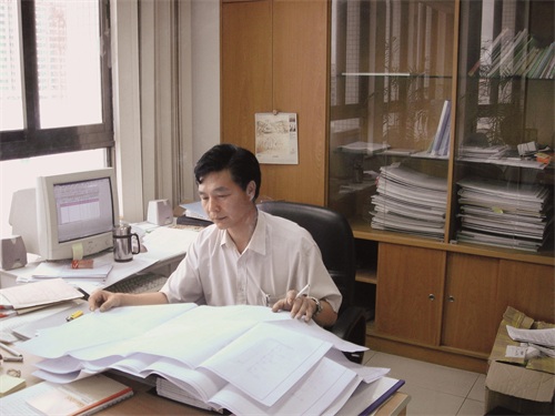 1995年6月,欧阳祥山在香港丰润集团办公室研究设计图纸。