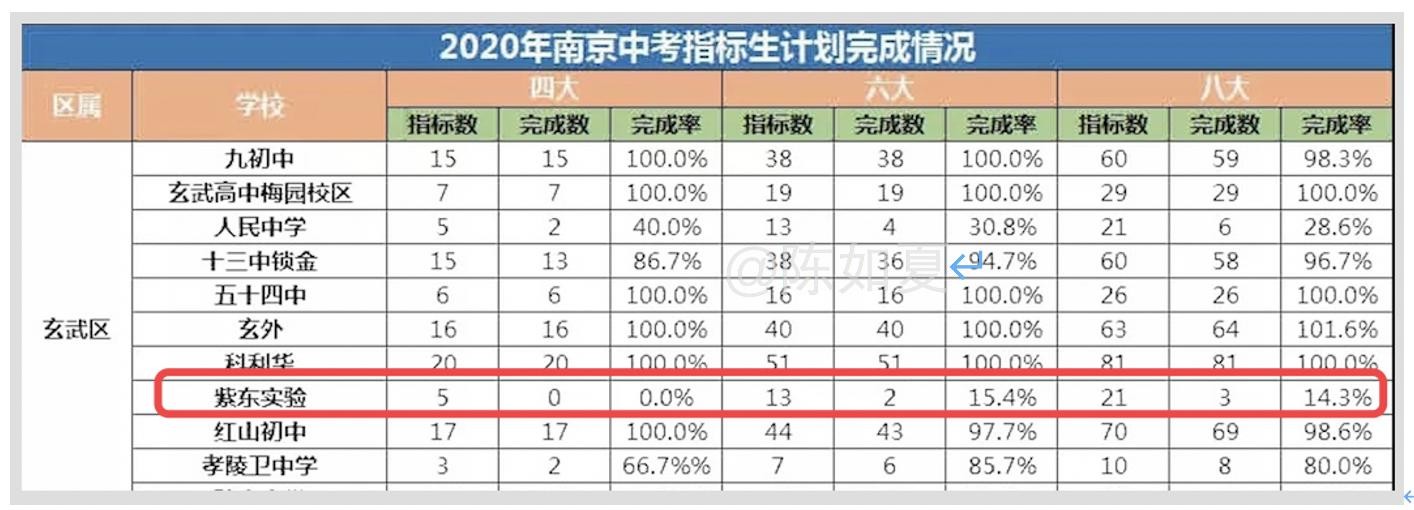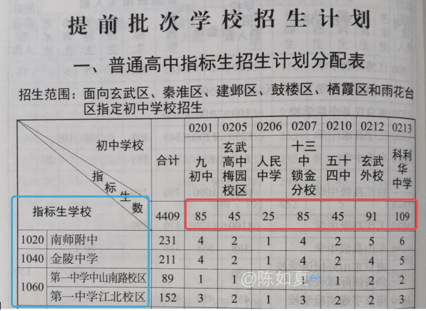 我们拿实际情况来举例,如下图“南京市的指标生分配表”,左侧篮框中的是重点高中,红框内是重点高中给每所初中分配的直升名额。
