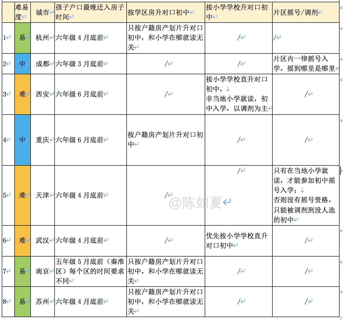 因为我孩子现在北京读小学四年级,所以按小学转学难易,买房能否上对口初中,把每个城市按难易做了标记,最终满足要求的有:杭州、重庆、南京、苏州