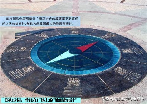 在石碑的后面,有一片花岗岩地坪的广场,广场正中央原先在玻璃罩下面有一个直径将近两米的指南针,当时被称为是国内最大的地面指南针,现在只能看见周围环绕着的“乾、兑、离、震、巽、坎、艮、坤”八个大字了。