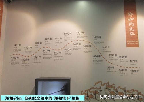 郑和塑像身后,环立着八面木牌,分别记述了以郑和七次下西洋的概况及历史意义为主要内容的“郑和七下西洋大事记”和“万邦千国朝大明”等文字。其中提及,“据《明实录》记载,自洪武二年(1369)二月至正统十四年(1449)八月的80年间,亚非国家(日本、朝鲜等与郑和下西洋无关的国家除外)对华使节的派遣共694次。其中,洪武时期的29年中,来使183次,平均每年来使6次。永乐时期的21年中,来使318次,平均每年来使15次;洪熙时期的1年中,来使10次;宣德时期的9年中,来使79次,平均每年来使近9次;正统时期的14年中,来使104次,平均每年来使7次。明初的5个朝代中,以郑和下西洋时期的永乐朝来使最为频繁,并且层次高,人数多。”