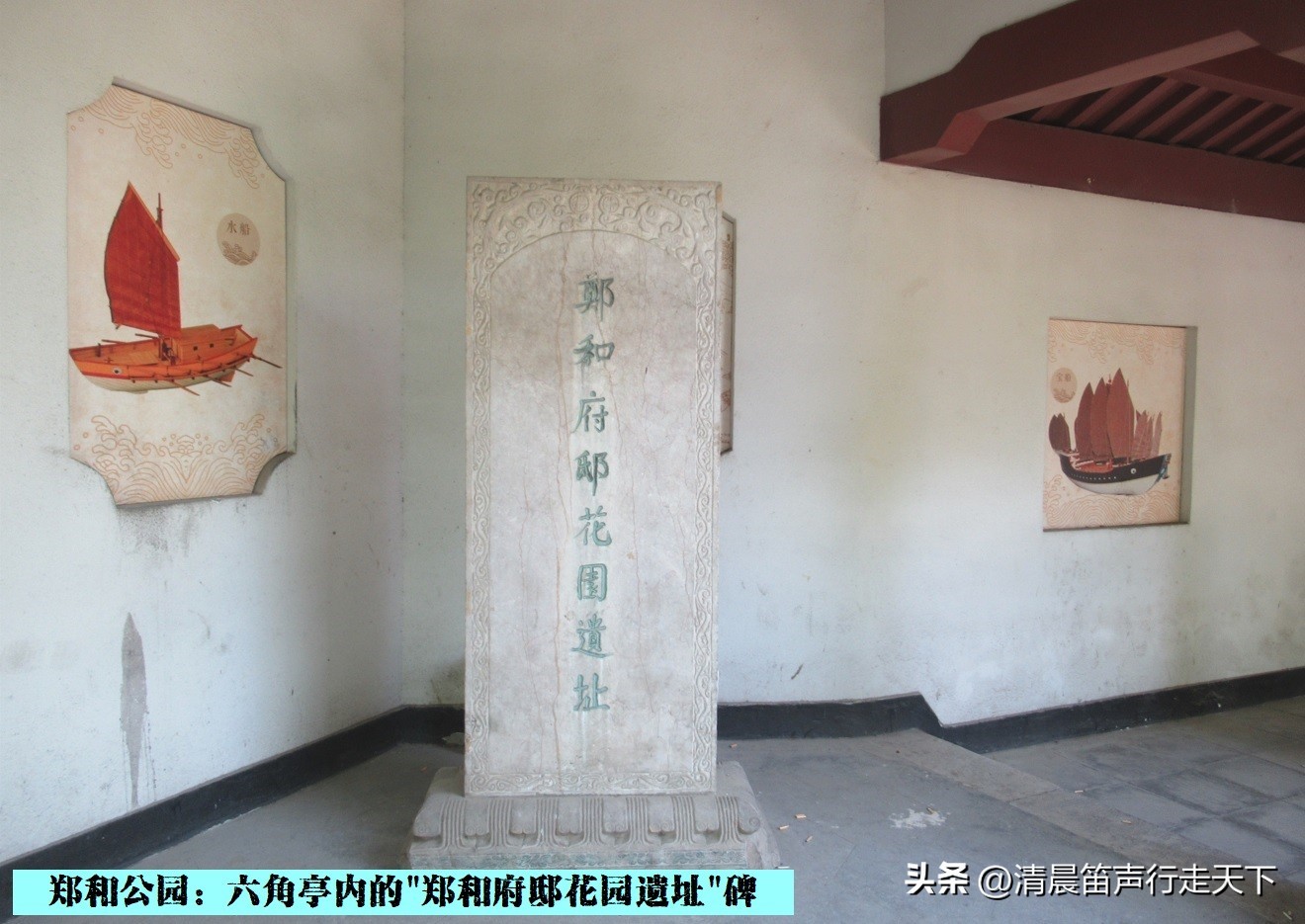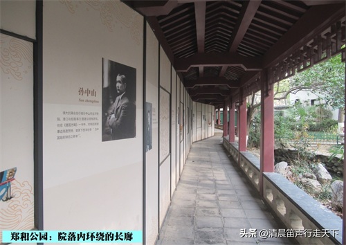 郑和纪念馆的院内曲径通幽,花木繁茂,绿树成荫,翠竹掩映,四周绕以长廊、花墙。长廊一侧还悬挂有一些与郑和相关的图画、照片和文字。