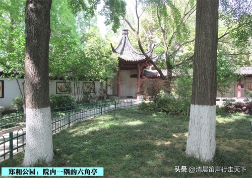 郑和纪念馆内还设有学术讨论厅和六角亭,院内绿茵覆地,翠竹掩映,石径花墙,树影扶疏,具有江南园林之胜趣。