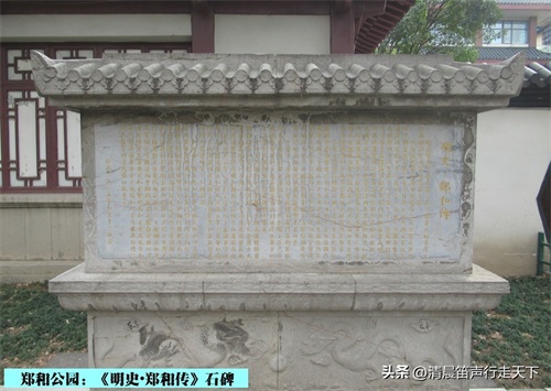 在庭院内郑和雕像的不远处,是一座《明史·郑和传》的石碑。《明史·郑和传》记录了郑和七下西洋史事和他建立的勋业,是研究郑和的最基本史料。石碑上镌刻的内容为: