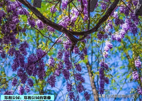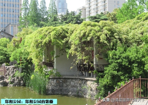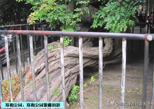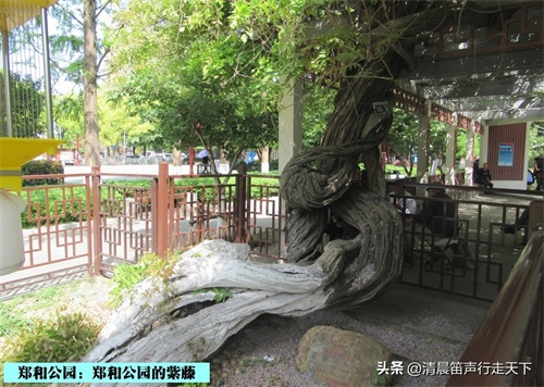 郑和公园内有一株紫藤,树龄已经有六百多年。在紫藤旁有着说明牌,其内容为,“郑和公园紫藤/树种:紫藤/树龄:607年/树高:3.2m/胸围:240cm”。说明牌上还有着更为详细的记载,“古树位置处于南京市秦淮区郑和公园内。郑和公园为郑和任南京守备时其府邸内的私家花园。据传当年的郑和府邸曾有房七十二间,院厢递进,整座府邸由大门、住室、车房、马厩、厨房、仓库以及后花园等组成。1985年为纪念郑和下西洋580周年,决定在该园东南角新建郑和纪念馆,并将此公园改名为郑和公园。古紫藤树高3.2米,胸围为2.4米,树冠南北向为2.5米,东西向为15米。2015年南京市绿化园林局为其编号‘826’,当时树龄为600年,至2022年已有607年,是南京主城树龄最大,覆盖面积最大的一棵紫藤,也是南京最古老的紫藤树之一。2022年,被南京市园林局评为‘金陵十大树王’。”