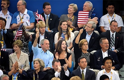 蓝衬衫的小布什,还有另一边的是他爹老布什,以及布什家族的其他成员,当天悉数坐进鸟巢,参与奥运盛事。
