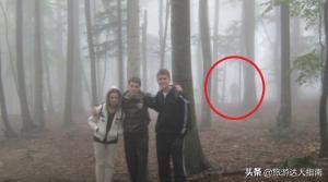 20.在这张照片中,一群朋友在郊游时拍照。旅行者注意到背景中徘徊着奇怪的深色阴影。