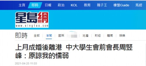 报道称,周竖峰称,自己在3月15日结婚,4月25日离港,他声称“虽是仓卒(促)出逃,短期内仍有一瓦遮头三餐糊口,一切尚能应付”。他还形容自己的行为是懦夫,并向“手足”道歉,“希望大家原谅我的懦弱”云云。