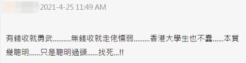 对于周竖峰自曝已离开香港,在乱港分子聚集的网络平台“连登”讨论区,有网友讽刺周竖峰:有钱收就勇武,无钱收就走佬懦弱,香港大学生也不蠢,本质几聪明,只是聪明过头,找死!↓