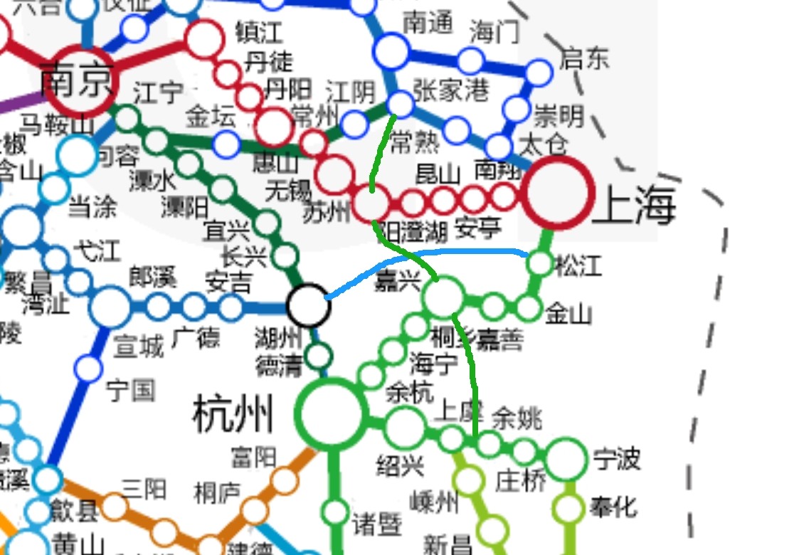 湖州接轨上海一直都是老大难,还要去杭州嘉兴绕一圈后到上海,黄花菜早就凉了。如今湖州南浔直接路过苏州后直达上海,唯一可惜的是这条线路被安排路过松江,而不是直接进入青浦。