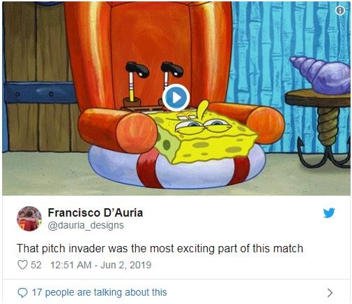 有的网友则认为,“那个球场入侵者是这场比赛最激动人心的地方。”