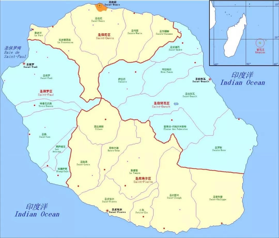 分为4个专区(无实权),24个市镇。4个专区是:圣但尼、圣保罗、圣皮埃尔、圣伯努瓦。