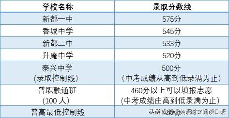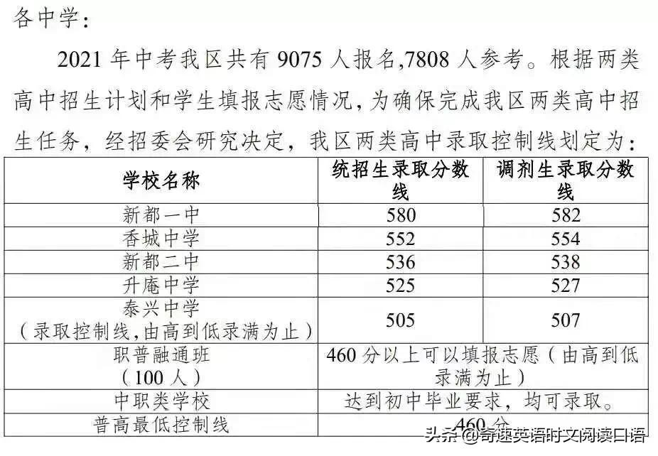 2021新都区区内高中中考划线如下: