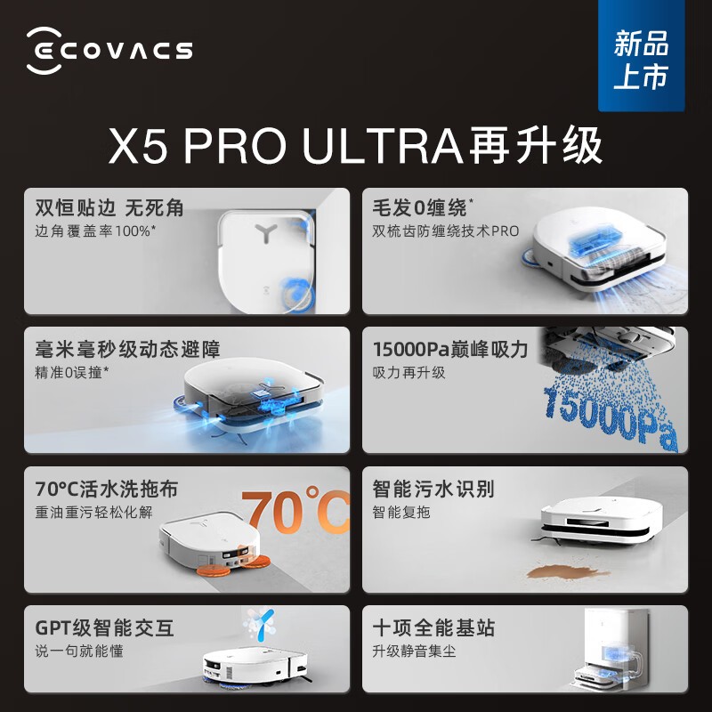 在清洁功能上,X5 PRO ULTRA同样表现出色。它采用了高温银离子净洗技术,能够有效去除拖布上的细菌和异味,确保家居卫生。同时,其智能避障功能也比旧款更强,能够精准识别障碍物,避免碰撞和掉落,提升了使用体验。