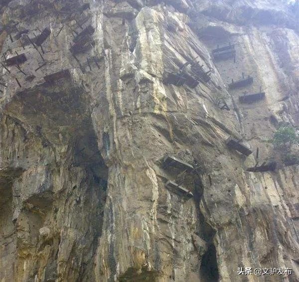 悬棺葬在中国分布较广,但现存最多、最集中的地方,是四川珙县的麻塘坝和苏麻湾两处,悬岩峭壁上存放有两百多具棺木,多数属于“岩桩式”类型,当地俗称“挂岩子”。悬棺离地面高度一般在25-50米,高的可达百米,真是罕见的“空中墓地”。
