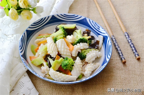 材料:新鲜鱿鱼2只 辅料:西蓝花 泡发的黑木耳 胡萝卜 姜丝 调料:鱼露(没有用盐代替) 糖 胡椒粉