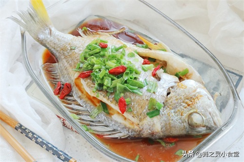 食材:海鲫鱼一只400克,枸杞少许,葱花和姜适量,蒸鱼豉油1小勺,糖一点点香油几滴。