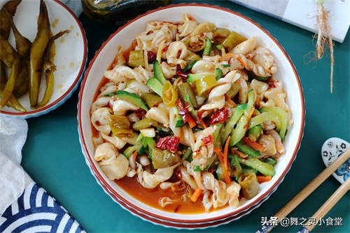 小唠叨:1、鱼泡清洗要先将内部空气排出,然后加入盐和面粉抓拿,多抓拿几次可以很好的去腥。2、鱼泡炒制是要先焯烫的,这样让腥味也能进一步去掉,但是焯烫时间要快,不能太久避免影响口感。3、豆瓣酱或者辣椒酱都是和泡椒很好的搭配,小火炒香,然后加入材料翻炒,要大火快炒才好吃。