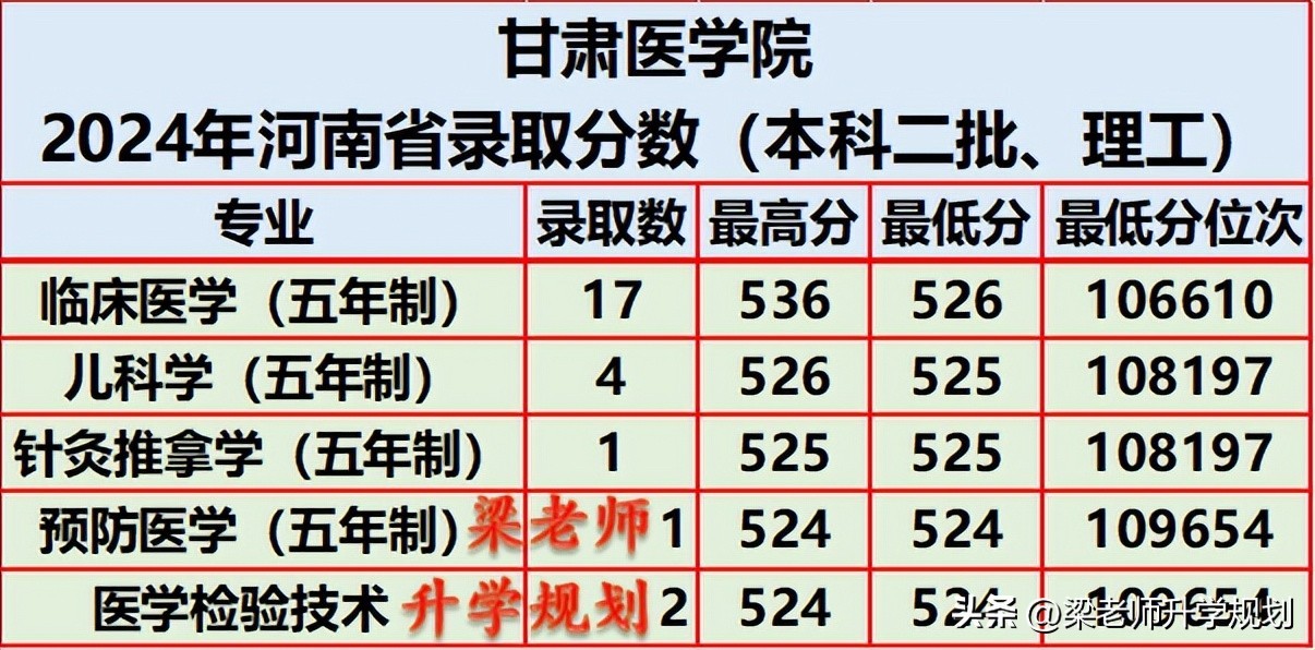 甘肃医学院2024年在河南省分专业录取分数