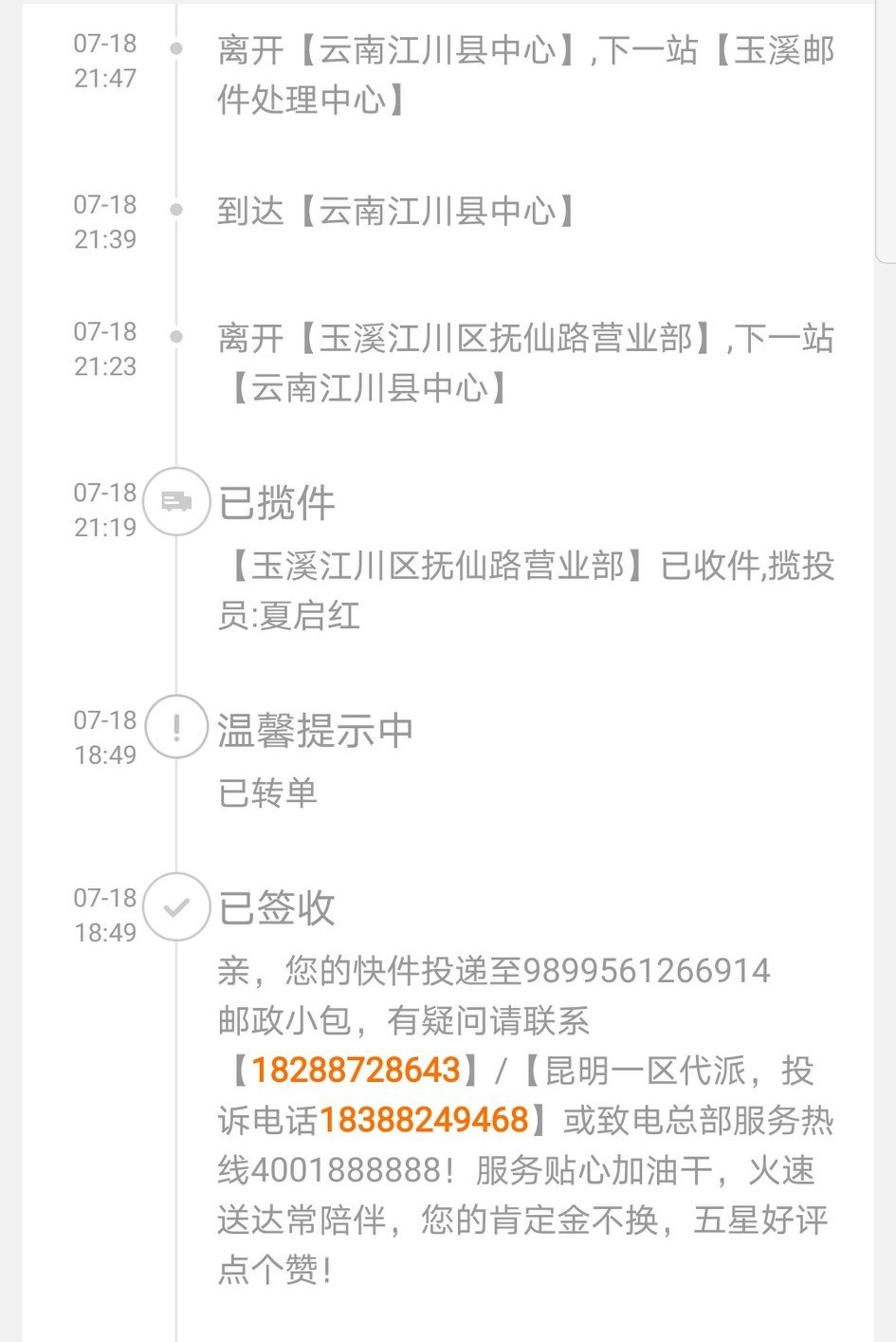 最近,在某宝分别购买了两次宝贝,远在2000余公里以外的商家发货都非常及时,可令人非常不解和迷惑的却是,货品在到达天天快递派送点(信息显示:“正在派送”)后,又被转单给邮政快递并远离昆明,发往距离昆明100多公里外的江川县和玉溪市,往返了200余公里,本来当天就能收到的货品,却被耽误了近2天时间。