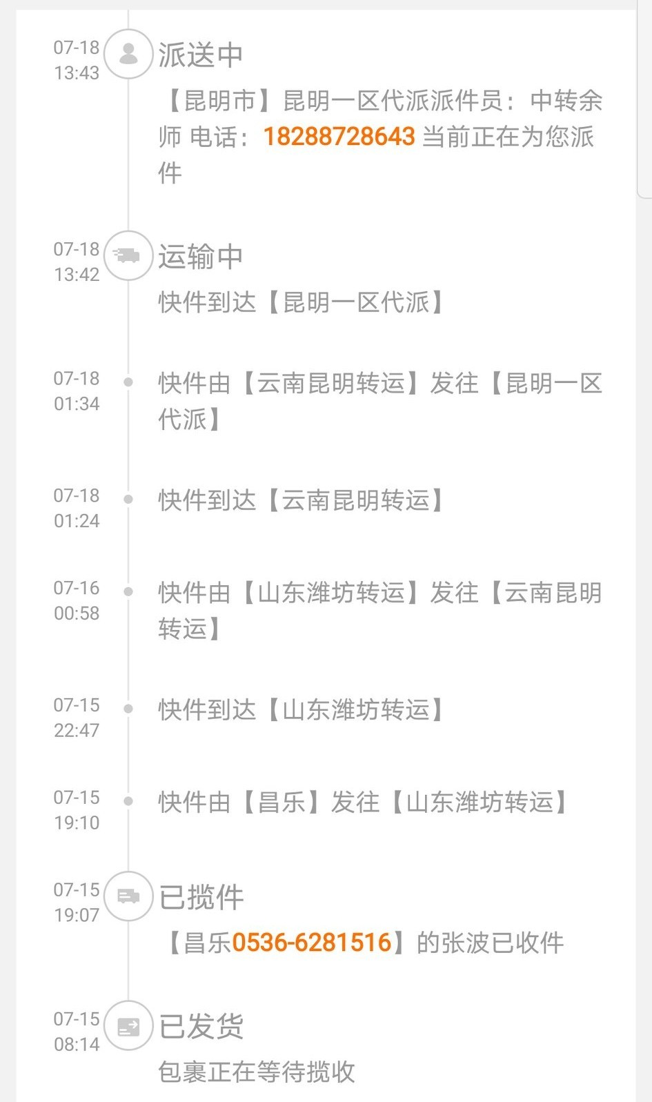 一件货从山东潍坊发货到达昆明市区,约2500公里仅用3天时间。但在到达昆明收货人附近不到2公的咫尺距离,却用了2天。