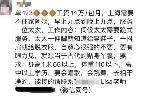 近日,一份关于上海有钱人家女佣的条件曝光引发了广泛的关注。据透露,这些女佣所获得的月薪竟然高达2万,并且享受着各种福利待遇。然而,这些亮眼的数字背后,却隐藏着太多羞于说出口的秘密。