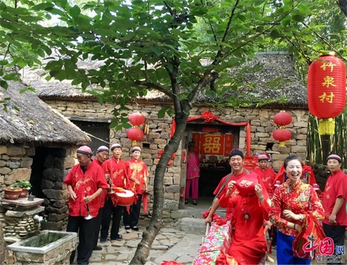 当地村民们表演沂蒙特有的婚嫁仪式,这里轻松愉悦的氛围是令许多游客流连忘返的根本所在。张蔚蓝/摄