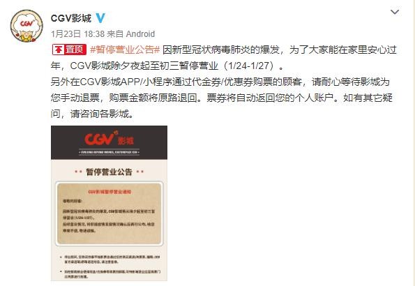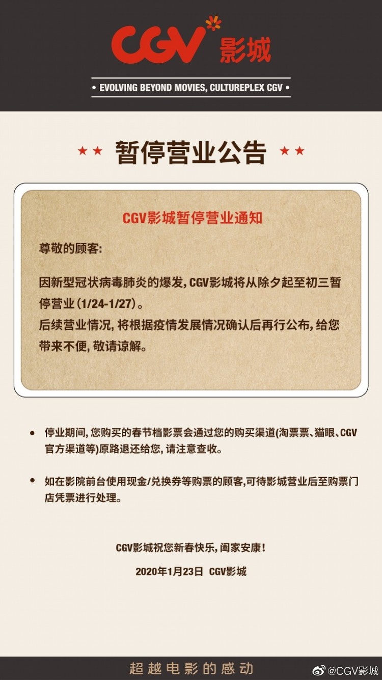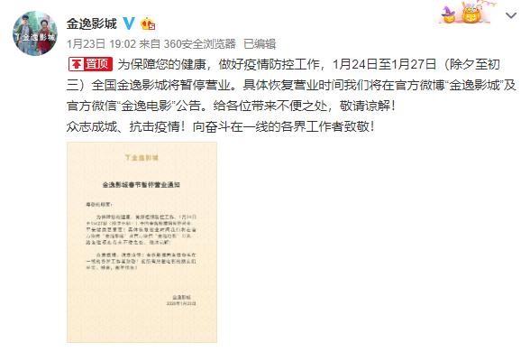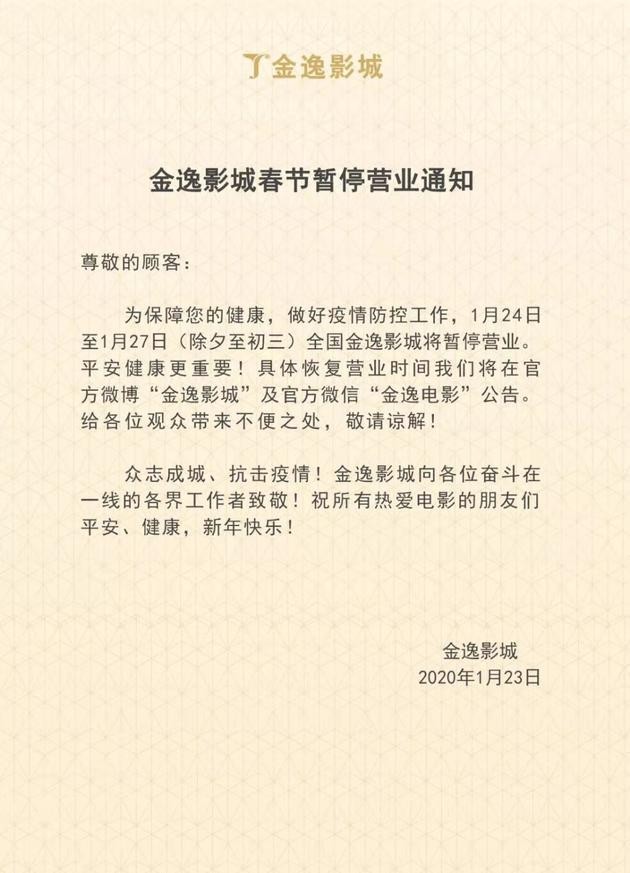 金逸影城、CGV影城、博纳国际影城也均发布公告称,1月24日至1月27日暂停营业,具体恢复营业情况,按照疫情发展,另行通知。
