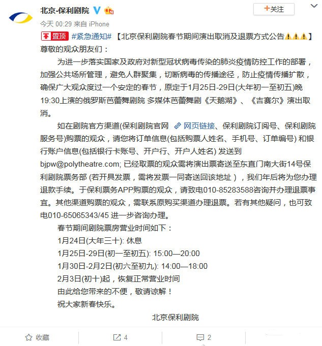 南都讯1月24日凌晨,北京保利剧院、北京人民艺术剧院先后发布公告,为防止疫情传播扩散,取消春节期间的演出,北京人艺戏剧博物馆将从1月24日起闭馆。据悉,已发布停演通知北京地区的剧团、剧场还有天桥剧场、北京剧院、木偶剧院、北京音乐厅、中山音乐堂、梅兰芳大剧院、长安大戏院、全国地方戏演出中心、北京京剧院、国家京剧院、北方昆曲剧院等。