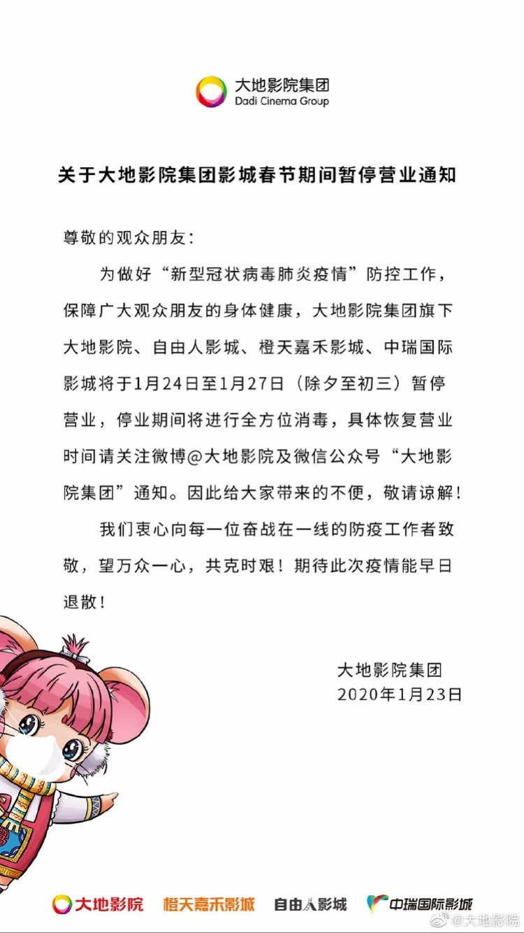 国内第二大院线(影投)公司大地影院集团在1月23日晚公告称,旗下大地影院、自由人影城、橙天嘉禾影城、中瑞国际影城于1月24日至1月27日暂停营业,停业期间将进行全方位消毒,具体恢复营业时间请等待官方通知。