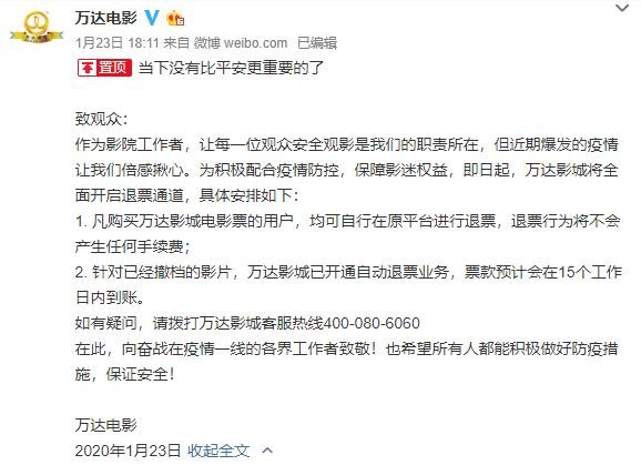 国内最大电影院线公司万达电影,截至发稿暂未宣布春节期间是否有暂停营业计划,但万达电影早先公布了退票事宜,购买万达影城电影票的用户,均可自行在原平台退票,不会产生任何手续费;已经撤档的影片,万达影城已开通自动退票业务,票款预计会在15个工作日内到账。