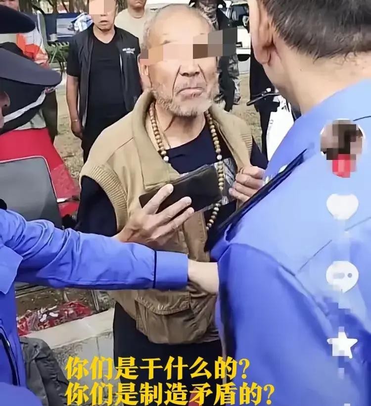 原来,其他执法人员要清理大爷摊位上的商品,大爷为了保护自己的货物,拼了老命和他们争论。可是,尽管大爷用尽全身力气呼喊和抵抗,他的摊位还是被清理了。于是,大爷情绪激动,一直喊:“你们都是干什么的,你们制造矛盾的”?