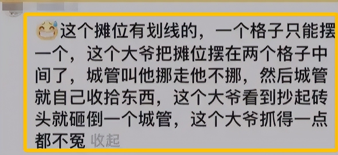 那位大爷和他老伴在市场摆摊,可能不小心占了多个摊位。规矩是规矩,一个身份证就对应一个摊位。城管来了,看到这情况,就让大爷清理多占的摊位。