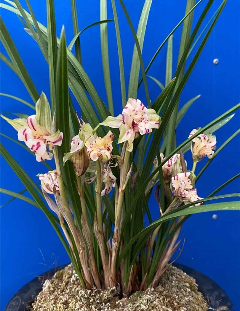 到了2001年正月,此花已有五苗壮苗,并且再次复花,这次开花就更厉害了,两个花箭均是一杆两朵,而且花型似乎增大了不少,颜色也变得很粉嫩。这一年3月份,彭州决定举办兰展,谢某、蓝某一合计,也希望将此花亮相,等曝光后再来慢慢炒作。