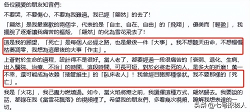 她不愿意那样的活着,不愿意成为卧床老人,网友猜测这个人就是她的老公。