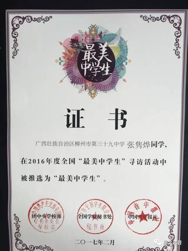 在由全国学联秘书处、团中央学校部、中国青年报社联合主办的2016年度全国“最美中学生”寻访活动中,广西柳州市第39中学2014(2)班张隽烨同学荣获全国 “最美中学生”称号,是柳州市唯一获此殊荣的初中生。
